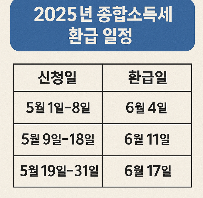 종합소득세 환급은 납세자가 종소세 신고를 완료한 이후, 국세청이 해당 내용을 심사해 환급 대상 여부를 확정한 뒤에 진행됩니다. 2025년 종합소득세 신고 기간은 5월 1일부터 5월 31일까지이며, 환급은 보통 이 기간 이후인 6월 중순부터 8월 초 사이에 이뤄지는 경우가 많습니다.
